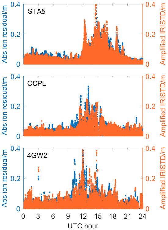 In the middle panel of Figure 8, the fitting graph depicting the absolute value of ionospheric delay modeling residuals for the CCPL station and the IRISTD for the virtual reference station is presented. The fitting function is . The amplification factor for the IRISTD for the CCPL station is similar to values found for the analysis mentioned earlier, indicating the rationality of the stochastic model used in this study. The fitting graph depicting the absolute value of ionospheric delay modeling residuals for the 4GW2 station and the IRISTD for the virtual reference station is presented in the right panel of Figure 8. The fitting function is . To better express the similarity between the ionospheric delay modeling residuals and the amplified IRISTD, in the top panel of Figure 9, a comparison is made between the absolute value of the ionospheric delay modeling residuals for the STA5 station and the amplified IRISTD, using a factor of . Similarly, a comparison is depicted for the CCPL station in the middle panel of Figure 9, using a factor of , and the bottom panel of Figure 9 shows a comparison for the 4GW2 station, using a factor of . By comparing Figure 7 and Figure 9, it can be observed that the amplified IRISTD can better represent the fluctuations and magnitudes of the ionospheric delay modeling residuals compared to the unamplified IRISTD.
