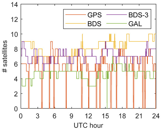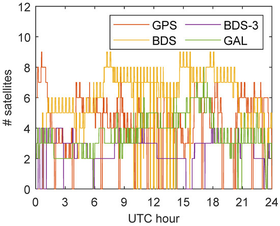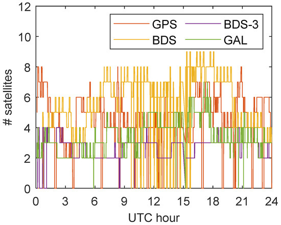 Figure 10 shows the number of satellites satisfying the experimental frequency points for the STA5 station. By selecting common-view satellites, the three groups of experiments maintain the same number of common-view satellites. Figure 11 shows, respectively, the positioning errors in three directions (North/East/Up) for the ionosphere-fixed model, the ionosphere-float model, and the ionosphere-weighted model proposed in this study. The measurement noise variance for the ionospheric pseudo-observations in the ionosphere-weighted model is as mentioned earlier, which is the square of the amplified IRISTD obtained from the stochastic model , and the measurement noise variance for the ionospheric pseudo-observations is .