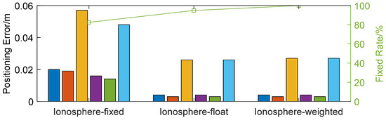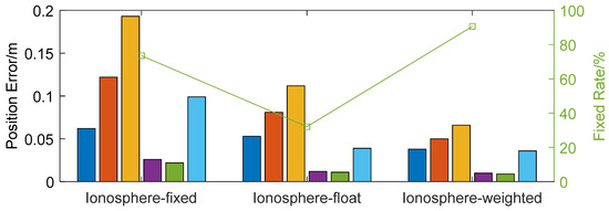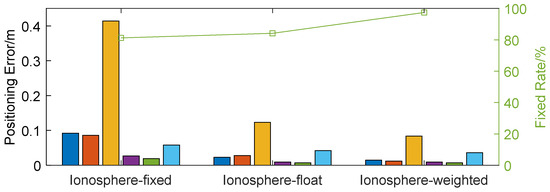 Figure 12 presents the positioning errors for the three ionospheric models for the STA5 station. Please refer to Table 3 for the specific positioning accuracy and other information. The ionosphere-weighted model shows a fixed rate improvement of 17.5% compared to the ionosphere-fixed model and 5.1% compared to the ionosphere-float model. The positioning accuracy in the North, East, and Up directions is improved by 80.0%, 84.2%, and 52.6%, respectively, compared to the ionosphere-fixed model. The positioning accuracy of the ionosphere-float model is almost consistent with that of the ionosphere-weighted model. The mean error of all three models in the Up direction is −0.015 m, −0.018 m, and −0.019 m, respectively. The mean error in the Up direction is relatively small, due to the error of the relative tropospheric delay being absorbed to the Up direction by more than 3 times [33]; thus, the RTK positioning results in this study are less affected by tropospheric delay modeling residuals and more affected by ionospheric delay modeling residuals.