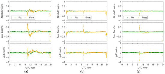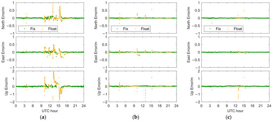 The positioning errors of different ionospheric models for the simulated rover station STA5; (a) ionosphere-fixed model; (b) ionosphere-float model; (c) ionosphere-weighted model.