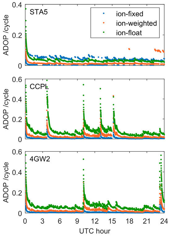 Figure 19 shows the ADOP values for the ionospheric models for the STA5 station, CCPL station, and 4GW2 station, respectively. From the figure, it can be observed that the ionosphere-fixed model exhibits the fastest convergence rate, followed by the ionosphere-weighted model, while the ionosphere-float model shows the weakest strength.