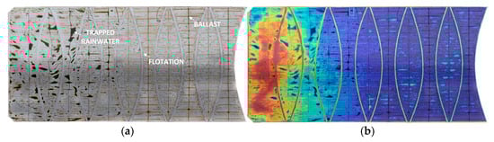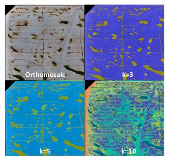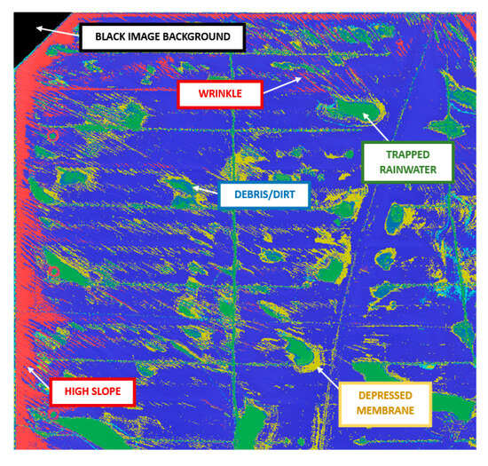 The present work only included the image processing step of transforming the DEM and orthomosaic to a global reference point. Further applications of morphology and digital image processing techniques, such as contrast correction adjustment, can enhance the quality of the image before performing k-means filtering. Nonetheless, the k-means filtering method has demonstrated its robustness in effectively identifying distinct groups associated with the membrane covers with different luminance characteristics (Groups 6 and 7), as well as unrelated image backgrounds (Group 5), without the need for extensive preprocessing procedures. Group 5 was immediately excluded from the analysis due to the primary objective of demonstrating the filtering of features specific to the asset. In the case of extending the filtering process to the entire image, this approach would consequently identify Group 5 as an undesirable feature as well.