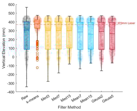 Significant differences in statistical measurements were observed when the k-means filtering method was applied compared to the raw data and classical filtering methods. Specifically, there was a 54.2% increase in mean and a 24.5% increase in median relative to those of the raw data, whereas the classical filtering methods showed a relative decrease in mean of up to 5.0% and a relative decrease in median value of up to 15.2% relative to those of the raw data. Furthermore, the standard deviation of the k-means filtered elevations exhibited a significant reduction of 57.2% relative to those of the raw data, while classical filtering methods showed relative reductions in standard deviation ranging from 2.2% to 14.1% relative to those of the raw data. Notably, the majority of the elevations obtained through the k-means filtering method demonstrated a close correspondence with the laser survey measurement of 370 mm, particularly in mean and median values, with relative percentage errors of 1.0% and 3.8%, respectively.