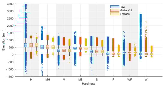 The k-means filtered data showed a significant average reduction of 59.4% in the proportion of outliers compared to the outliers of raw data. Particularly, the hard and medium scum hardness levels exhibited substantial reductions of 80.2% and 85.4% in the proportion of outliers relative to those of raw data, respectively. This reduction was attributed to the removal of large water bodies, which were predominantly present in these regions. In contrast, when considering the median filtered data, the most substantial reductions in the proportion of outliers were observed in the hard, medium, and fluffy scum hardness, with reductions of 37.4%, 14.9%, and 7.0%, respectively, relative to those of raw data. Conversely, the remaining scum hardness levels exhibited relative reductions of less than 3.5%. The k-means filtered data also showed an average reduction of 36.3% in standard deviation relative to the standard deviation of raw data, with significant relative standard deviation reductions of 62.5% and 46.7% observed in the water–fluffy and fluffy scum hardness levels, respectively. These reductions were attributed to the removal of ballast, the water surrounding the ballast, and debris/dirt, which were prevalent in these regions. For the median filter, the majority of scum hardness levels showed outlier reductions of less than 7.4% relative to those of raw data, except for the water scum hardness, which exhibited a significant relative outlier reduction of 19.7%. Similar to the previous findings, it was observed that the median filter is efficient in removing impulse noises from raw data. However, the k-means filtering method exhibits notable effectiveness in its ability to filter unwanted features, including those that contain significant noises, resulting in reduced variance and fewer outliers in elevation distributions.