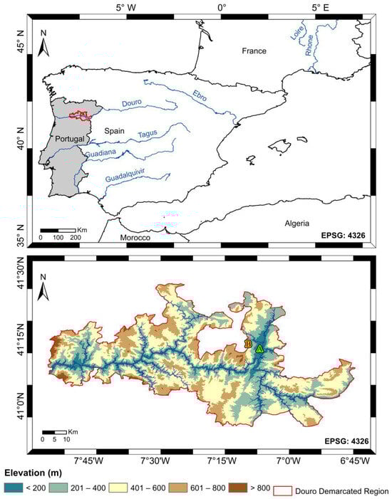 The climate in the DDR is a warm temperate Mediterranean-type, which is characterized by moderately cool and rainy winters and hot and dry summers but with a noteworthy decrease in precipitation and an increase in continentality from west to east as we move away from the Atlantic coastline []. The topography is decisive in this regard, as the Marão and the Montemuro mountainous ranges to the west shelter humid air from the Atlantic Ocean from coming in at a constant rate throughout the year. Moreover, the various deep valleys and tall hills promote the formation of distinct features of the local climate, mainly due to mesoscale circulation systems within the Iberian Douro/Duero catchment (e.g., katabatic and anabatic winds). One example of such a valley is the already mentioned Vilariça Valley, where the formation of morning frost is common due to the thermal inversion of air masses []. This valley is represented in Figure 1 by the letters A (longitude: 7.11°W; latitude: 41.22°N) and B (longitude: −7.15°W; latitude: 41.24°N). This spatial variability allows for the specialized production of fruit and wine, with their properties differing between the different meso and microclimates.