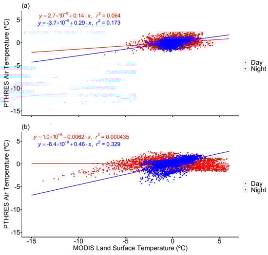 Winter MODIS land surface temperature and PTHRES air temperature at points A and B in the Vilariça Valley during (a) day and (b) night times. Values correspond to the centered moving mean with a span of 11 days, which in turn corresponded to the mean of values available for each day in the period between 2002 and 2020.