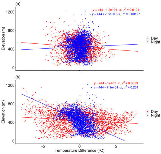Temperature differences (LST–2mT) versus elevation scatterplots and respective linear regression models in (a) winter and (b) summer.