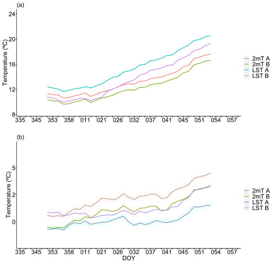 When comparing the LST and 2mT, during the daytime, the LST was higher than the 2mT in A and B, both temperatures remained fairly stable until DOY (day of the year) 11, and, afterwards, they increased. During the nighttime, the LST was lower than the 2mT in A, while in B, it was higher until DOY 11, and, after that, it was lower. The LST was fairly constant until DOY 41, and it started increasing afterwards. As for the 2mT, it started increasing earlier in DOY 358. Lastly, the Spearman coefficients indicated a strong correlation between the two temperatures for the daytime (ρ > 0.84) and a mild to strong correlation for the nighttime (ρ > 0.66) and were all statistically significant (Table 3).