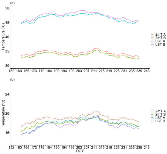 Summer MODIS land surface temperature and PTHRES air temperature at points A and B in the Vilariça Valley during (a) day and (b) night times. Values correspond to the centered moving mean with a span of 11 days, which in turn corresponded to the mean of values available for each day in the period between 2002 and 2020.
