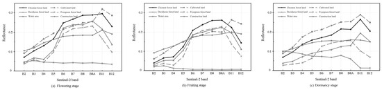 Reflectance curve of chestnut forest land and other surface feature types at (a) flowering stage, (b) fruit stage, and (c) dormancy stage.