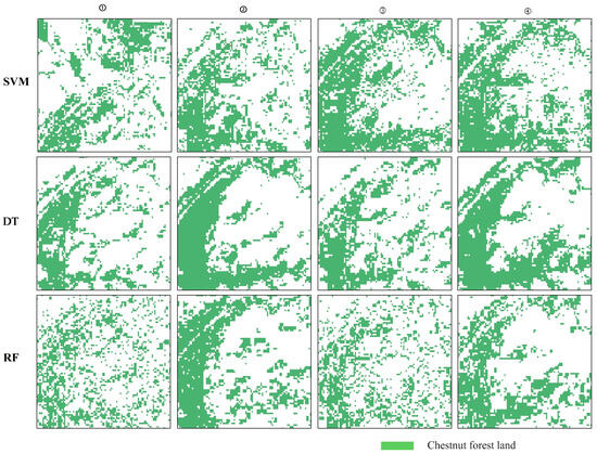 The accuracy results of each classification method (see Figure 6) show that the method (i.e., the fourth combination of eigenvalues) based on spectral and vegetation characteristics considering topographic and phenological features has the best effect. In particular, considering phenological characteristics is evidently better than not considering phenological characteristics in these recognition methods. Compared with the third combination of eigenvalues, the overall accuracy and Kappa coefficient of the fourth combination of eigenvalues are improved by 4.1%, 0.73%, 1.62%, and 0.0541, 0.0096, and 0.0198, corresponding to the results of the SVM, DT, and RF algorithms, respectively. Among the three machine learning algorithms, the RF algorithm has the highest accuracy. Under the fourth eigenvalue combination, the overall accuracy and Kappa coefficient are increased to 98.52% and 0.9820, and the user’s accuracy and producer’s accuracy of chestnut forest land are increased to 97.25% and 99.46%, respectively.