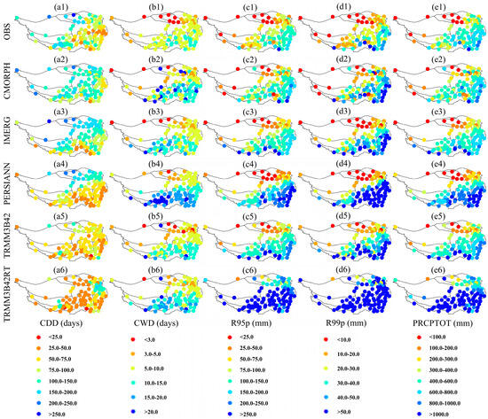 Figure 2 depicts the mean spatial pattern of five SEPIs (CDD, CWD, R95p, R99p, and PRCPTOT) derived from ground-based observations (OBS) and five SPPs (CMORPH, IMERG, PERSIANN, TRMM3B42, and TRMM3B42RT).