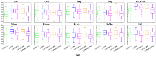 For the two precipitation-amount-based indices of CDD and CWD, SPPs perform better for CDD and worse for CWD. For the three precipitation-amount-based indices of R95p, R99p, and PRCPTOT, SPPs perform best for PRCPTOT and worst for R99p.