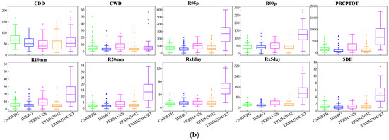 Regarding the two precipitation-frequency-based indices (R10 mm and R20 mm), SPPs exhibit better performance for R10 mm but worse performance for R20 mm. However, when it comes to the three indices related to precipitation intensity (Rx1day, Rx5day, and SDII), SPPs demonstrate superior performance for Rx5day and SDII, but the poorest performance for Rx1day.