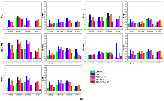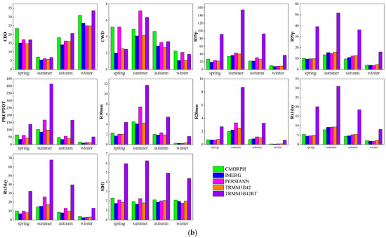 As shown in Figure 5, for all SEPIs, IMERG exhibits the most favorable performance among all the SPPs, displaying the highest CCs and the lowest RMSEs during the spring season. TRMM3B42 follows IMERG in terms of performance. Conversely, CMORPH and TRMM3B42RT demonstrate poorer performance, characterized by lower CC values and higher RMSE values, particularly TRMM3B42RT. During summer, IMERG displays the highest CC and RMSE values for over half of the SEPIs, while TRMM3B42 ranks second with slightly higher CCs and RMSEs. Conversely, PERSIANN and TRMM3B42RT perform inversely, with TRMM3B42RT showing particularly poor results. For autumn and winter, IMERG and TRMM3B42 consistently demonstrate higher CCs and lower RMSEs for most SEPIs. Overall, IMERG outperforms other products with higher CCs and lower RMSEs across all seasons, exhibiting a significant advantage during spring. TRMM3B42 follows IMERG as the second-best performer. Conversely, TRMM3B42RT consistently displays lower CCs and higher RMSEs in all seasons, with RMSE values notably higher compared to other products. Generally, SPPs perform better during summer and autumn compared to spring and winter.