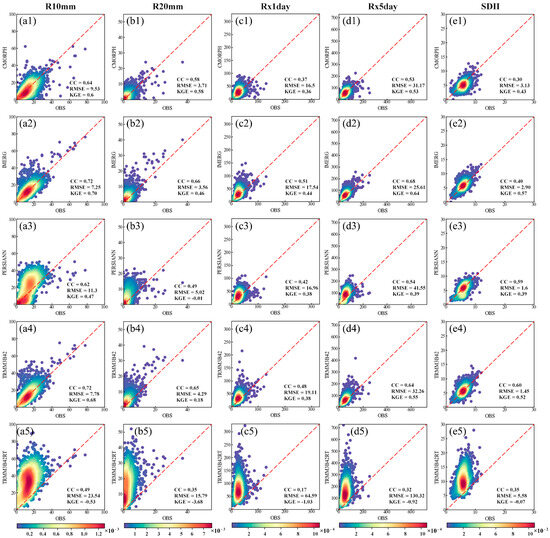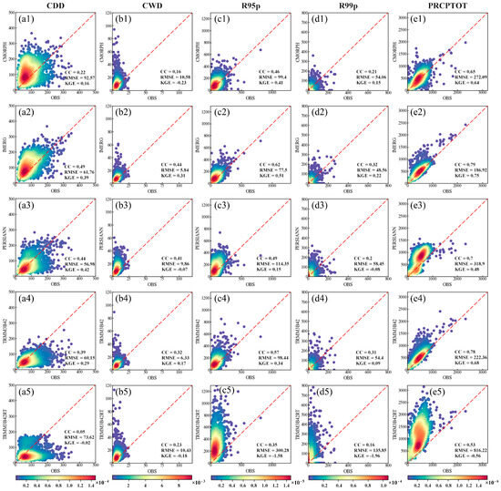 Scatter density plots of SEPIs based on precipitation amount and duration including (a) CDD, (b) CWD, (c) R95p, (d) R99p, and (e) PRCPTOT, between OBS and five SPPs over the period 2001–2015 in the QTP.