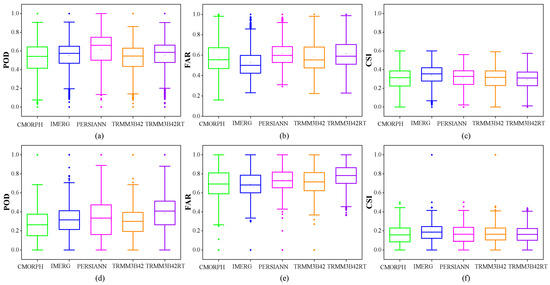 Boxplots of three skill metrics for five SPPs (CMORPH, IMERG, PERSIANN, TRMM3B42 and TRMM3B42RT) in detecting the occurrences of the daily precipitation events (a–c) and daily extreme precipitation events (d–f).