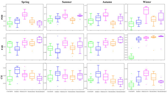 Figure 10 depicts boxplots that showcase the three categorical skill metrics of five SPPs in identifying extreme precipitation occurrences on a seasonal level from 2001 to 2015 across the QTP. The results indicate that during the summer, the SPPs exhibit the highest POD (mean 0.31–0.45) and CSI (mean 0.18–0.21), and the lowest FAR (mean 0.67–0.71) compared to other seasons. In contrast, winter shows lower POD and CSI values for all SPPs, along with higher FAR values, indicating the weakest detection ability for extreme precipitation events during this season. TRMM3B42RT consistently demonstrates the highest FAR values across all four seasons, ranging from 0.89 in summer to 0.98 in winter, suggesting its limited accuracy in detecting extreme precipitation events. On the other hand, IMERG exhibits higher POD values (0.11–0.36), the highest CSI values (0.11–0.30), and the lowest FAR values (0.67–0.78) in all four seasons. These findings indicate that IMERG has more accurate detection ability of the extreme precipitation events, especially in the fall when its detection ability is far higher than that of other SPPs. It should also be noted that except for winter, the POD of IMERG is slight lower than PERSIANN, while the CSI of IMERG is significantly higher than other SPPs. It may be related to overestimate in PERSIANN.