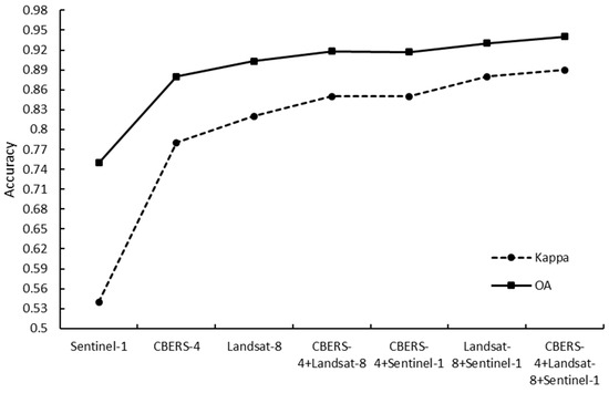 | CBERS-04 + Landsat-8 + Sentinel-1 | 94.0% | 0.89 | 86.3% | 0.73 | 92.5% | 0.87 | 91.9% | 0.86 | 89.3% | 0.81 | 7.6% | 0.03 |
