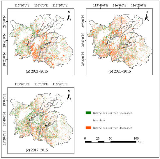 - The area of impervious surfaces in Nanchang exhibited a diminishing trend moving from the city center to the outskirts.