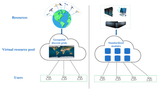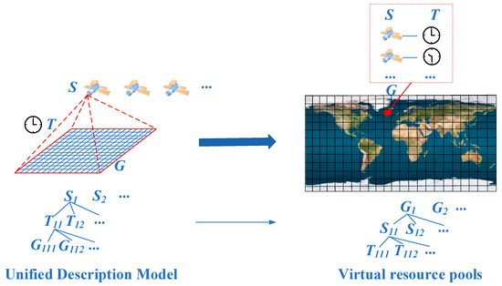 The virtual resource pool of remote sensing satellite Earth observation capabilities is formed by virtualizing all satellite observation resources with uniform specifications. It takes the spatial grid as the basic unit for describing the Earth observation capability, and then encodes the observations of all satellites into grids that cover the whole surface of the Earth. The virtual resource pool thus contains the global coverage of all remote sensing satellites. The resource scheduling problem, whatever the observational need, can be solved by means of searching the virtual resource pool. The conceptual schematic of the virtual resource pool storing remote sensing satellite observation capability is shown in Figure 5. In general, the establishment of a virtual resource pool is an important method for integrating a large number of diversified satellite resources and efficiently matching user requirements.