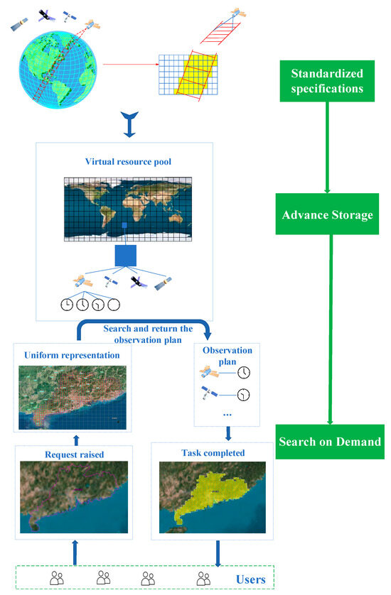 The principle of SDSO is shown in Figure 2. It has three parts: unified specification, advanced storage, and search on demand, which form the research framework of SDSO. First, unified specification is defined to describe the observation capability of remote sensing satellites. It addresses the issues of inconsistent specifications and units in traditional path + row + time point sequence schemes, which have led to underutilization of satellite resources. Essentially, it employs a set of models and consistent specifications to uniformly describe the ground coverage capacities of various satellite types. The observation capabilities of different remote sensing satellites are abstracted into discrete minimum units based on uniform specifications. This forms the foundation for establishing a virtual resource pool and enables unified management and access to a vast array of diversified satellite resources.