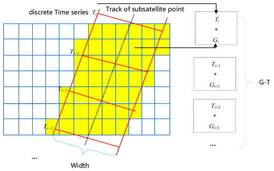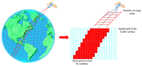 To address these issues, we established a unified description for the observation capabilities of remote sensing satellites. This method takes the multi-scale two-dimensional Earth segmentation grid and discrete time code as the basic units for the unified description of the observation capability of remote sensing satellites. First, we divide the two-dimensional surface of the Earth into a number of spatial grids such that any region on the Earth’s surface can be described by a collection of grids. The discrete spatial grid with time information is then used to describe the coverage of remote sensing satellites over a period of time, as shown in Figure 3. Compared with the traditional method, the advantage of the proposed description method is that it can realize the unified characterization of multiple types and large numbers of remote sensing satellite resources with consistent specifications. The grid-based method describing remote sensing satellite observation capability directly uses the spatial grid to visually demonstrate the coverage. The process of determining the coverage target is to search whether the corresponding grid exists in the set of grids describing the observation capability of some individual remote sensing satellites without the need for complex topological calculations. Therefore, it can be easily adapted to the user’s observation needs, providing an opportunity for mission-intensive scenarios.