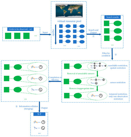 The satellite resource scheduling model, based on the SDSO concept, utilizes the virtual resource pool of remote sensing satellites’ Earth observation capabilities. It is a large-scale scheduling model that relies on the unified description model and virtual resource pool. It takes observation demand as input, satellite number + time (S-T) used to complete the task as output, and completes the scheduling task as early as possible as the goal. The execution flow of the model is shown in Figure 8, which is characterized by describing the solution process of the resource scheduling problem as the search and screening process of the linear table data. Compared with the traditional resource scheduling model, the solution speed is greatly accelerated, and it has a very obvious advantage in the calculation speed of hundreds of satellite resource scheduling problems. Additionally, according to different application scenarios, different data screening programs can be designed that have a greater potential for complex application scenarios. In the following section, the model is described and the algorithm is introduced.