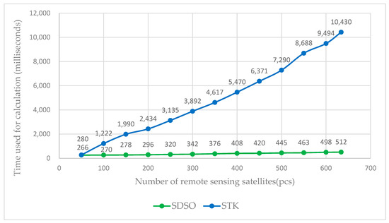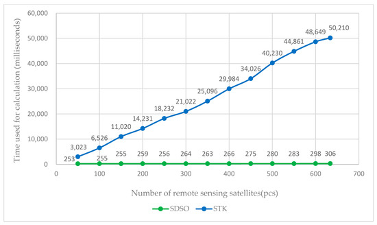 Figure 14, Figure 15 and Figure 16 show the time profiles of the three scenarios of large area fast coverage, multi-target fast observation, and moving target tracking, respectively. The two lines in each figure represent STK and SDSO, respectively. The horizontal axis is the number of available remote sensing satellites and the vertical axis is the time required for computation. In the following, these three experiments are referred to as Group I, Group II, and Group III, respectively. Focusing on the time consumed for computation, the results of the three sets of experiments have obvious similarities. It can be found that in the experiment of scheduling 634 satellites, the time consumed by the SDSO is much smaller than that of STK. By observing the trend of the curves, it can also be found that the growth rate of the time consumed by the SDSO is significantly smaller than that of STK as the number of available remote sensing satellites rises.