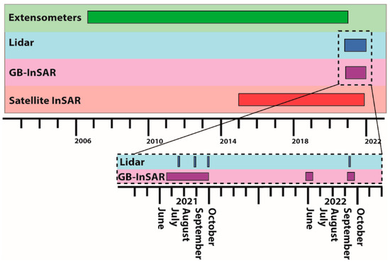 Several different remote techniques were used to characterize the rock mass and monitor the various movements at different spatial scales (Table 1). The canton of Ticino started monitoring in 2006 using manual extensometers in open cracks to measure their aperture every year (Figure 1c,d). A more intensive monitoring started in 2021 with LiDAR and GB-InSAR campaigns and the processing of the Sentinel-1 satellite radar images by Gamma AG. Figure 4 presents the temporal coverage for each remote sensing technique used in the study.