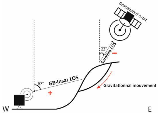 Figure 5. Expected displacement signs along the satellite and GB-InSAR LOS. GB- and satellite InSAR, respectively, provide data on sub-horizontal and sub-vertical displacements.