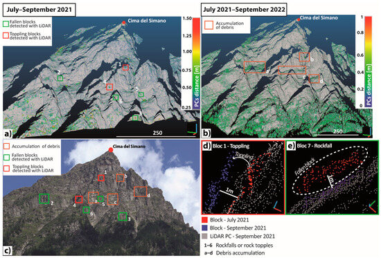 Figure 7. Rockfall sources, topplings and accumulation of debris detected by LiDAR PCs comparison. (a) Distance between PCs acquired in July 2021 and September 2021 and detection of rockfalls and toppling blocks. (b) Distance between PCs acquired in July 2021 and September 2022 and detection of debris from rockfalls. (c) Rockfalls, topplings and debris accumulations reported on a panorama. (d) Details of block 1 in toppling: the points forming the block in September (blue) are farther from the cliff than those forming the bloc in July (red). (e) Details of block 7 that fell between July and September 2021: the points belonging to the PC of September (blue) are aligned with the vertical cliff and thus belong to the latter, whereas the points from the PC of July (red) delineate the fallen block.