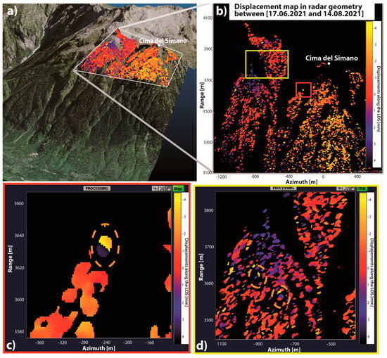 Figure 8. Wrapped GB-InSAR interferogram between June 2021 and August 2021 highlighting toppling blocks. The positive displacement values correspond to displacements toward the GB-InSAR. (a) The interferogram in geographical coordinates draped on a 3D orthophoto. (b) Interferogram in radar geometry (c). (d) Zoom on zones where toppling movements are detected. The upper part of each toppling block shows negative displacements due to wrapping effects.