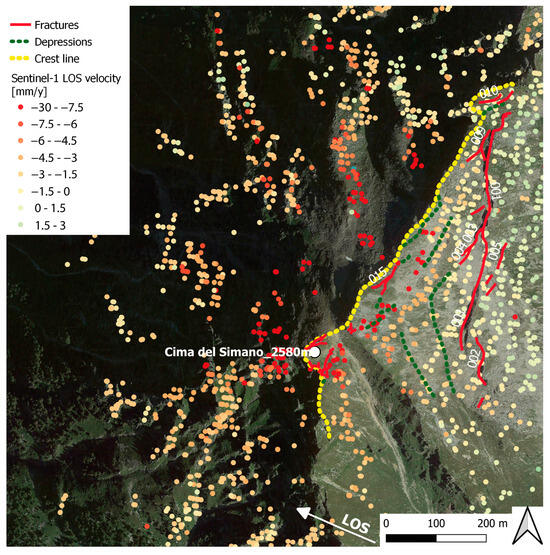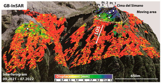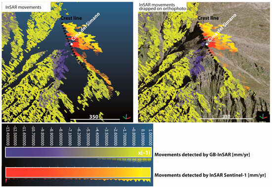 Since InSAR monitoring collects data only in the LOS of the device, GB-InSAR and satellite InSAR provide information along the line making an angle with the vertical of, respectively, 67° and 23° (Figure 5). According to the topography and the fracture orientations, the displacement direction of the unstable volume is expected to be down- and westwards. Thus, it is expected to find negative movement in the LOS of the satellite and positive ones in the LOS of the GB-InSAR.
