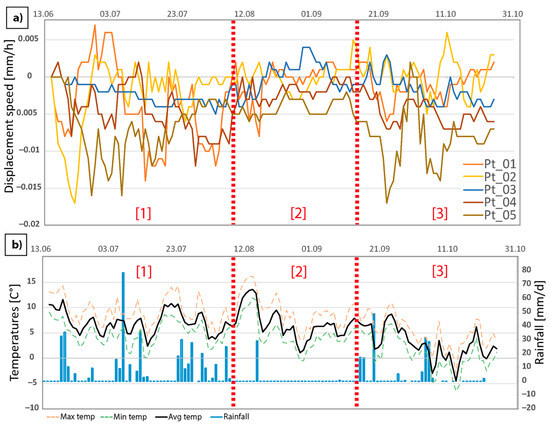 Additionally, height points located on the cliff (Figure 9) and showing signs of movements according to the GB-InSAR were selected and their displacement speeds during the 4 months of GB-InSAR monitoring in 2021 are plotted (Figure 13a), as well as the temperatures and precipitations recorded by the meteorological station SLFI2 (Figure 13b).