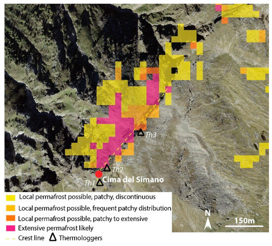 The negative temperatures registered by TH3down suggest the potential presence of permafrost at depth, as suggested by the Swiss Federal Office for the Environment (OFEN, [70]) on the Swisstopo portal (Figure 16). But with the climate changes it may have disappeared, causing the destabilization of the surface, and the recent acceleration of global warming could increase this destabilization.