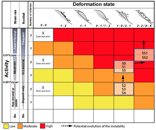 Deep-seated instability scenarios, ‘S0’ to ‘S5’ (3 × 106 m3–5 × 107 m3), are also proposed. ‘S0’, ‘S1’ deep-seated rock instabilities and the wedge ‘S5’, delimitated by the InSAR displacement results, correspond to a proven active zone with a mean displacement speed of 7 mm/yr. An attempt to qualify the scenarios suggests low to moderate hazard failure susceptibility. The weathering impact on the slope constraints and the erosions could be further investigated by means of numerical modeling, as already suggested by some studies [74,75,76]. Those investigations could help to assess the possible evolution of the instability in terms of hazard susceptibility.