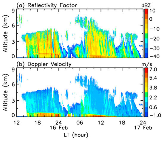 (a) Reflectivity factor and (b) Doppler velocity from MMCR observations between 12:00 on 16 February and 24:00 on 17 February 2022.