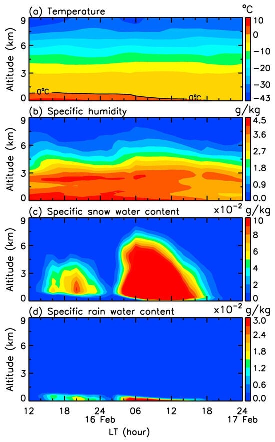 (a) Temperature, (b) specific humidity, and (c) specific rainwater and (d) snow-water contents from ERA5 reanalysis data between 12:00 on 16 February and 24:00 on 17 February 2022.