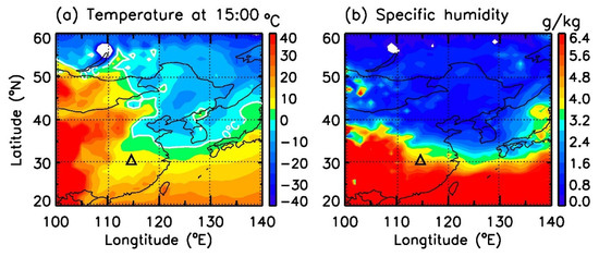 Distribution of (a) temperature and (b) specific humidity at the 1000 hPa level at 15:00 on 16 February from ERA5 reanalysis data. The black triangle represents the location of Wuhan.