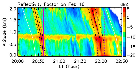 To investigate the variational features of hydrometeors across the melting layer observed by the Ka-band MMCR, we zoom in on the precipitation from 20:00 to 22:30 on 16 February, which is presented in Figure 4. One can note from Figure 4 that there are two periods of relatively strong precipitation with a reflectivity factor larger than −5 dBZ. The first and second periods last for about 5 min and 10 min, respectively. The environmental variation in precipitation particle growth may cause the formation of fall streaks that can be seen in radar measurements. Due to the presence of an atmospheric wind field, the hydrometeors can drift horizontally during their fall; thus, their trails are generally slanted in the height–time section from the radar observations. The slanted trails are referred to as the fall streaks [23], which are clearly shown in Figure 4. For these two periods, we use the solid black line to mark the central times (20:37 and 22:00 on the ground) at which the reflectivity generally has the local maximal values, and then mark the time periods of our attention with the dashed black lines. Although the streak slope can be affected by horizontal wind and its shear, and the microphysical characteristics of hydrometeors (size, density, and phase), the area designated by the dashed black lines is roughly consistent with the one with relatively strong reflectivities, indicating a certain rationality and feasibility of the chosen area. The radar observations in the vertical direction during the two periods are marked by the corresponding purple vertical lines.