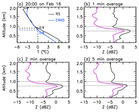(a) Profiles of temperature from (black) radiosonde and (blue) ERA5 reanalysis data at 20:00 on 16 February and reflectivity factor averaged in (b) 1, (c) 2, and (d) 5 min centered at 20:37 on ground. The black and purple curves denote the averaged value along the fall streaks and in the vertical direction, respectively. The dotted black horizontal lines denote the heights of local minimum and maximum reflectivities, respectively. In Panel (a), RS denotes the abbreviation of radiosonde, and the black and blue horizontal dashed lines represent the heights of the 0 °C level in the RS and ERA5 reanalysis data, respectively.