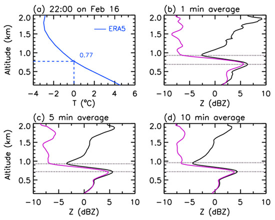 (a) Profiles of temperature from ERA5 reanalysis data at 22:00 on 16 February and reflectivity factor averaged in (b) 1, (c) 5, and (d) 10 min centered at 22:00 on the ground. The black and purple curves denote the averaged value along the fall streaks and in the vertical direction, respectively. The dotted black horizontal lines denote the heights of minimum and maximum reflectivities, respectively.