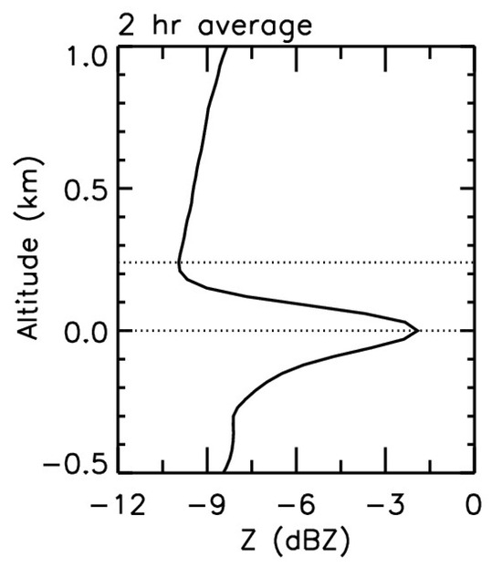 Profiles of reflectivity averaged from 20:26 to 22:26 in a bright band peak coordinate. The height of the bright band peak is taken as 0, and the observation of 2 h is denoted by the two white lines in Figure 4. The dotted black horizontal lines denote the heights of minimum and maximum reflectivities, respectively.