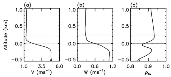 Figure 6 depicts the Doppler velocity, Doppler spectrum width, and cross-correlation coefficient averaged along the fall streaks from the MMCR observation for 5 min. It can be seen from Figure 6 that with the phase transition of hydrometeors, the reflectivity is strengthened mainly due to the increase in the dielectric constant from the melting of ice to water in the melting layer, and then decreases with the reduction in raindrop concentrations caused by the increasing fall speeds of raindrops; in this case, the bright band is observed in the reflectivity factor. In the melting layers, due to the droplet spectrum being broadened by the collision, coalescence, and even breakup of hydrometeors and the effects of turbulence and wind shear, the Doppler spectrum width also increases rapidly. As ice particles and snowflakes melt into raindrops, the Doppler velocity (spectrum width) of hydrometeors increases rapidly from the minimal value of 1.61 (0.31) ms−1 at 0.87 km to 4.89 (1.02) ms−1 at 0.57 km, and the height of 0.87 km is slightly lower than the 0.99 km of the dark valley, whereas the correlation coefficient displays a quick drop from 0.94 at the dark valley to 0.88 at the bright band peak, followed by a process of rapid growth and recovery. In the observation of S-band weather radar, the mean vertical profile of the correlation coefficient constructed through a series of range-height indicator (RHI) scans showed that the correlation coefficient decreases from about 0.91 to 0.84 after crossing the melting layer [54], and the correlation could drop to 0.85 for different elevation angles [55]. Early studies suggested that the correlation coefficient is influenced by mixed-phase hydrometeors, radar operating frequency, antenna elevation angles, and beam broadening [46,55,56,57].