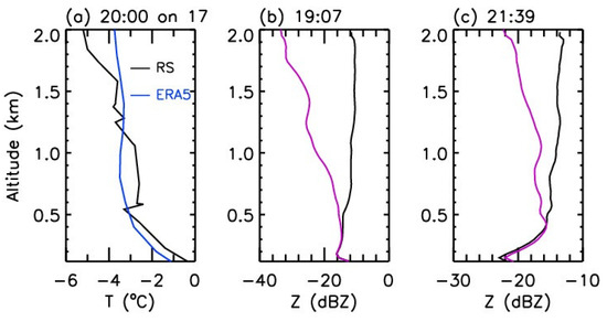 (a) Profiles of temperature from (black) radiosonde and (blue) ERA5 reanalysis data at 20:00 on 17 February and reflectivity factor averaged from 10 min centered at (b) 19:07 and (c) 21:39 on the ground. In Panel (a), RS denotes the abbreviation of radiosonde, and in panels (b,c), the black and purple curves denote the averaged value along the fall streaks and the vertical direction, respectively.