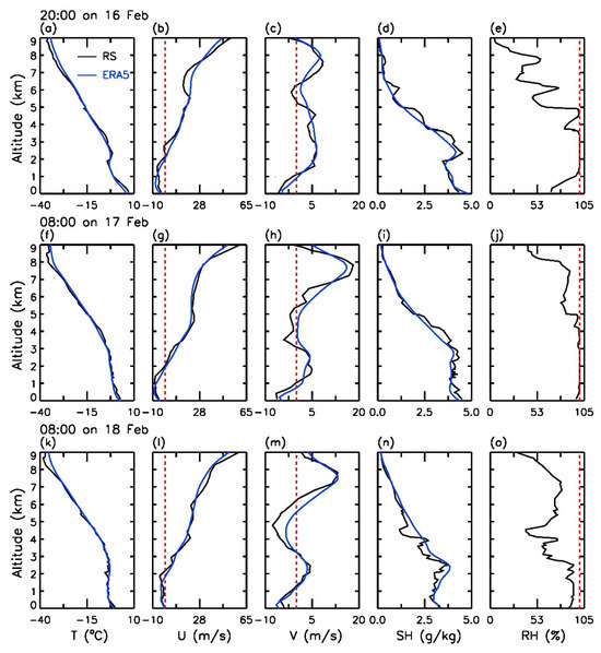 Profiles of (a) temperature, (b) zonal wind, (c) meridional wind, (d) specific humidity, and (e) relative humidity at 20:00 on 16 February from (black) radiosonde and (blue) ERA5 reanalysis data, and (f–j) and (k–o) are the same as (a–e) but for at 8:00 on 17 February and at 8:00 on 18 February, respectively. The dashed red line is marked at the zero wind speed in the second and third columns and at the relative humidity of 100% in the fifth column. In Panel (a), RS denotes the abbreviation of radiosonde.