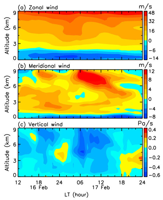 (a) Zonal wind, (b) meridional wind, and (c) vertical wind from ERA5 reanalysis data between 12:00 on 16 February and 24:00 on 17 February 2022.