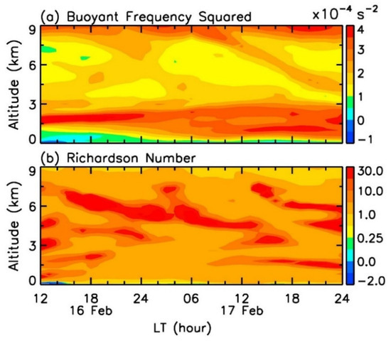 (a) Buoyant frequency squared and (b) Richardson number derived from ERA5 reanalysis data between 12:00 on 16 February and 24:00 on 17 February 2022.