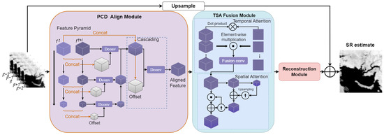 - Tian, Y.; Zhang, Y.; Fu, Y.; Xu, C. TDAN: Temporally-Deformable Alignment Network for Video Super-Resolution. In Proceedings of the IEEE/CVF Conference on Computer Vision and Pattern Recognition (CVPR), Seattle, WA, USA, 13–19 June 2020; pp. 3360–3369. [Google Scholar]